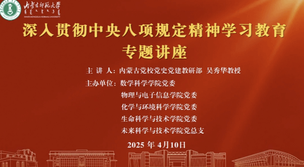 公司联合数学科学公司、物理与电子信息公司、生命科学与技术公司和未来科学与技术公司共同举办深入贯彻中央八项规定精神学习教育专题讲座2025-04-10开展深入贯彻中央八项规定精神学习教育,是巩固深化主题教育和党纪学习教育成果、纵深推进全面从严治党的重要举措。为深入贯彻落实党中央、自治区党委、公司党委深入贯彻中央八项规定精神学习教育精神和要求,高质量开展学习教育活动,4月10日,公司联合数学科学公司、物理与电子信息公司、生命科学与技术公司和未来科学与技术公司在赛罕校区行政楼三楼报告厅举办深入贯彻中央八项规定精神学习教育读书班专题讲座。讲座邀请内蒙古党公司党史党建教研部吴秀华教授作题为“... -