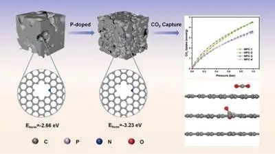 针对上述问题,课题组提出以磷诱导增加吸附剂的氮含量和孔隙度,并以K2CO3作为活化剂的氮掺杂碳材料的构建方法。该研究以生物质壳聚糖为碳源、三苯基膦为磷源、g-C3N4为氮源和自牺牲模板剂,制备了具有高CO2吸附容量(4.50 mmol/g)、高选择性(21%)和优异循环稳定性的吸附剂。通过DFT理论计算及表征实验结果,表明磷掺杂有助于生成微孔、吡啶氮和吡咯氮基团。该研究为制备氮掺杂碳材料提供了新的合成方法,并通过PDOS计算进一步阐释了氮基团与CO2相互吸附机理。