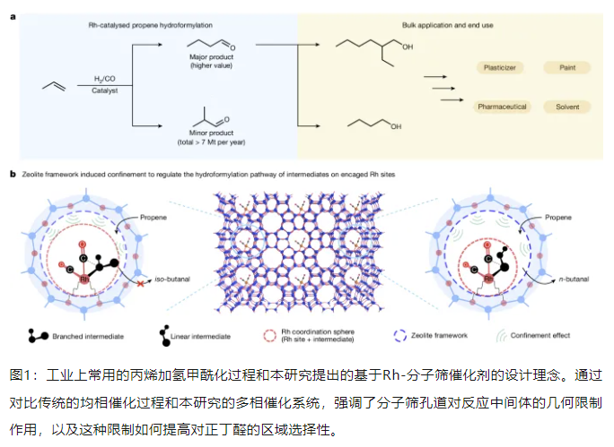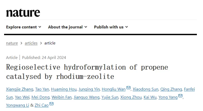 近日,公司1998届员工杨勇以通讯作者在《Nature》发表论文。该研究利用多相“铑-分子筛”负载型催化体系,首次实现了丙烯氢甲酰化以超高区域选择性制取出正丁醛。该团队将经典的分子筛骨架对反应中间体的“择形效应”拓展应用至分子筛骨架与结构清晰的铑活性位点之间形成的狭小限域空间,通过抑制在氢甲酰化反应中生成具有较大空间位阻的异丁醛中间体,实现了对目标产物正丁醛超过99%的区域选择性,同时醛类产物总选择性也高于99%,催化剂转化频率超过6500 h-1。上述催化性能结果超越了迄今为止报道的所有多相催化剂和几乎所有的均相催化剂。该研究不仅为如何通过多相催化的方法选择性获取热力学上更不稳定的反马式加成产物——正丁醛提供了一种新方法,也进一步拓展了经典分子筛骨架“择形催化”这一概念,也为目前丙烯氢甲酰化工业生产中存在的巨大挑战提供了新的解决思路与方法。4月24日,相关研究成果发表在《自然》(Nature)上。本研究工作得到国家重点研发计划、国家自然科学基金、中科合成油技术股份有限公司研究基金等的支持。