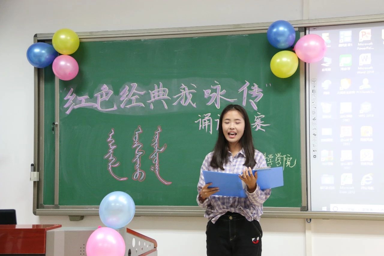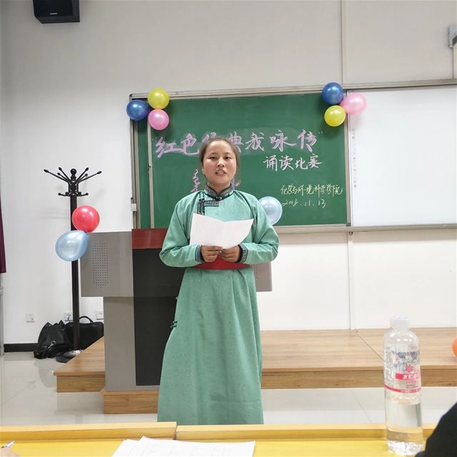 此次比赛由院员工会学习部承办。胡日查老师、何朝鲁门老师、王淑娟老师亲临本次比赛现场。11月13日晚7点,诵读比赛拉开了帷幕。各位选手诵读形式多样,或组合诵读,或个人独诵。其中12号选手王禹尧的一首《红色的十月》,张弛有度,声情并茂,并适当配以音乐,充分展现了诗文朗诵的艺术感染力和舞台表现力。获得了全场如雷鸣般的掌声。随着比赛的进行,比赛也掀起了一层又一层热浪,一波又一波高潮。《我爱你,祖国》、《我爱这土地》、《祖国颂》等诗篇都迎来了观众热烈的掌声。