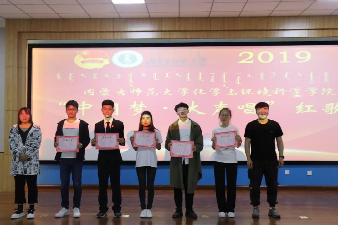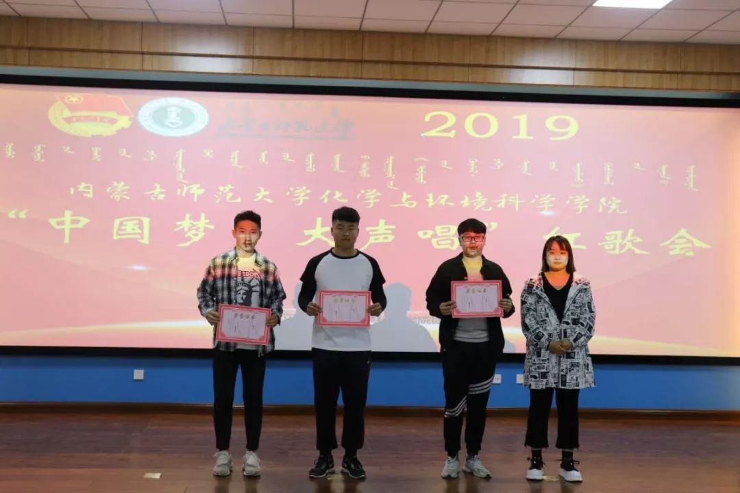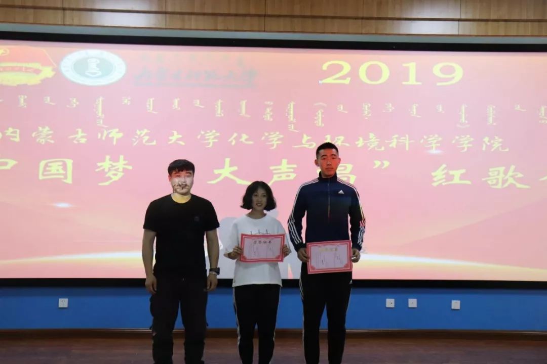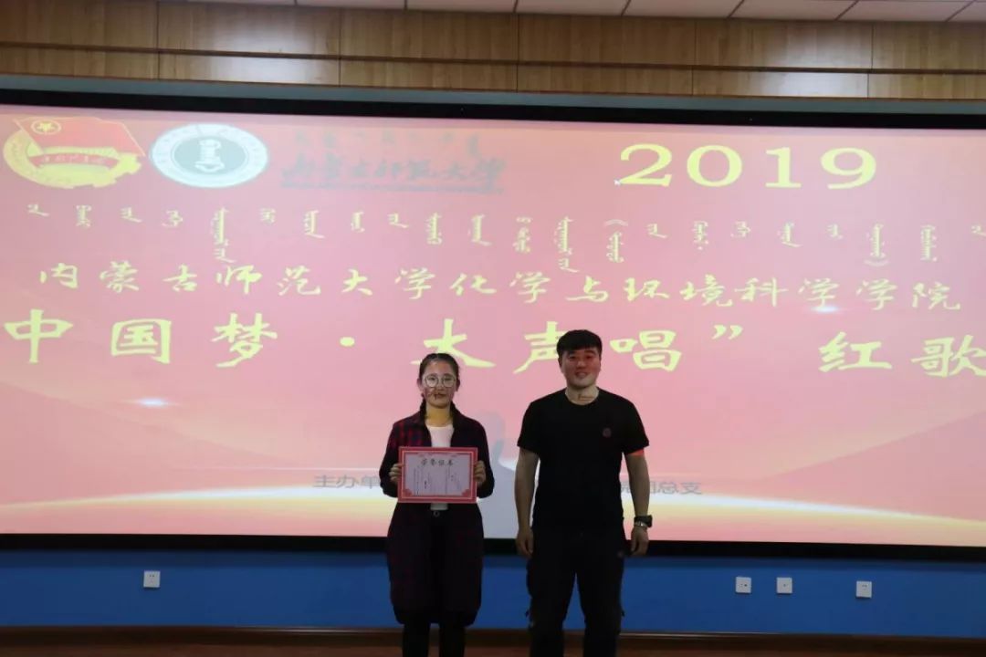 每个班级都为自己的努力,得到了满意的答卷,通过评委的打分最终分出一二三及优秀奖。获得一等奖的班级是2018级化汉一班;获得二等奖的班级是2017化学蒙班、2018级材料化学班;获得三等奖的班级是2017材料化学班、2018级化蒙二班、2018级环境蒙班;获得优秀奖的班级是2017级化学汉班、2017级环境汉班、2018级化汉二班、2018级化蒙一班、2018级环境汉班。并由何朝鲁门老师和白赛纳老师为获奖班级颁奖。斑斓的奖状、名次的高低并不意味着什么,而是通过演唱红歌的方式表达我们对历史的赞叹和对未来的憧憬。