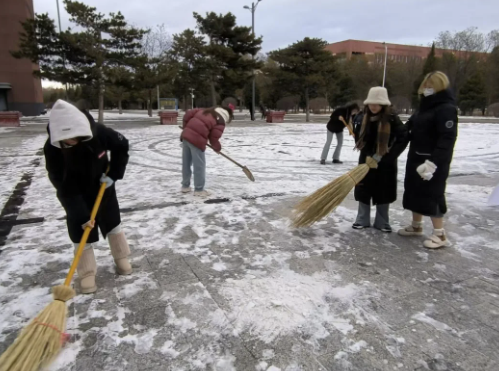他们不畏严寒毫不退缩,逆风而行相互协作,他们的身影在雪地里忙碌而坚定,成为了校园内一道亮丽的风景线。每一个动作都饱含着对校园的责任与担当,每一个笑容都传递着劳动的快乐与自豪。