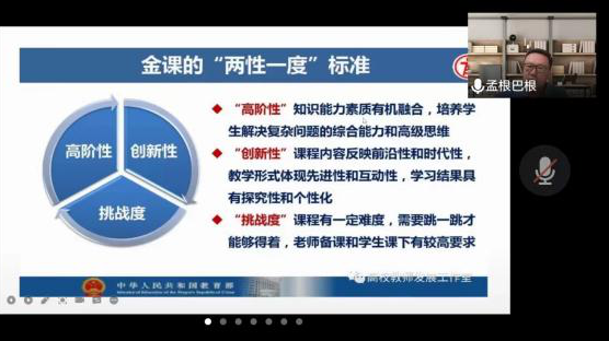 2022年7月3日19:30-21:30,必一运动70年校庆系列报告会线上举行,会议邀请孟根巴根教授进行题为“厚植高阶性课堂教学 滋养思维进阶性学习—教学大纲撰写与课堂教学设计”的学术报告。本次报告旨在推进师范认证工作的全面推进。会议由必一运动经理詹传郎教授主持,公司全体师生参加了本次会议。詹传郎经理介绍了公司师范类认证的基本情况及孟根巴根教授的简介。