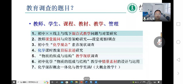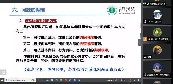 为提升公司实习生实习质量,强化实习工作中教育调查研究工作的有效实施,公司教学实践组邀请必一运动官网教育公司张凤英副教授为2019级正在进行教育实习的师范生,做了关于“问卷调查的设计与实施”的专题讲座。于6月25日晚7:00,通过线上形式进行。王海燕老师主持本次活动。张凤英老师从如何选题、常用的教育调查方法、问卷调查的设计与实施等方面结合实例进行了细致的讲解。