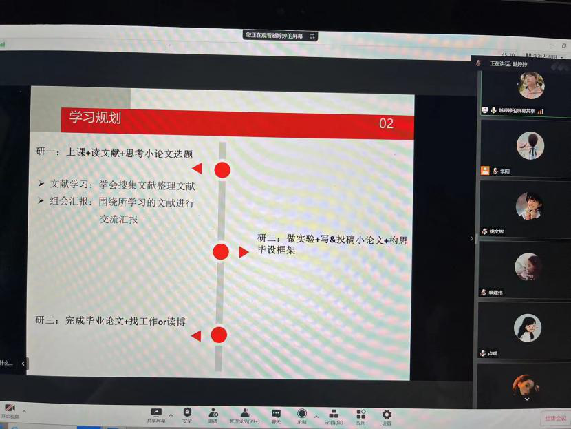 会议由研究生教学秘书张阳主持,公司2021年国家奖学金获得者特日格勒、李金昊、越婷婷、邹今岑四名同学以及2019级,2020级,2021级同学参加了此次分享会。