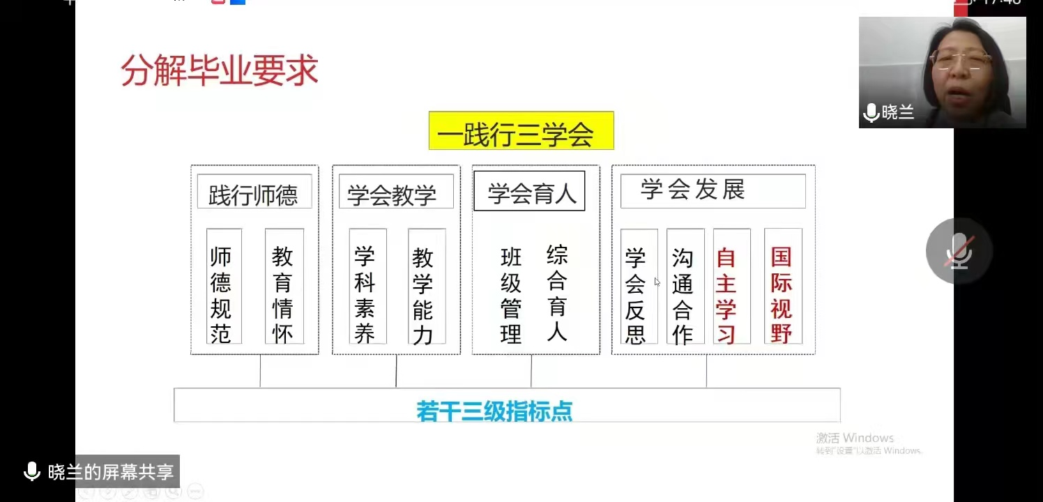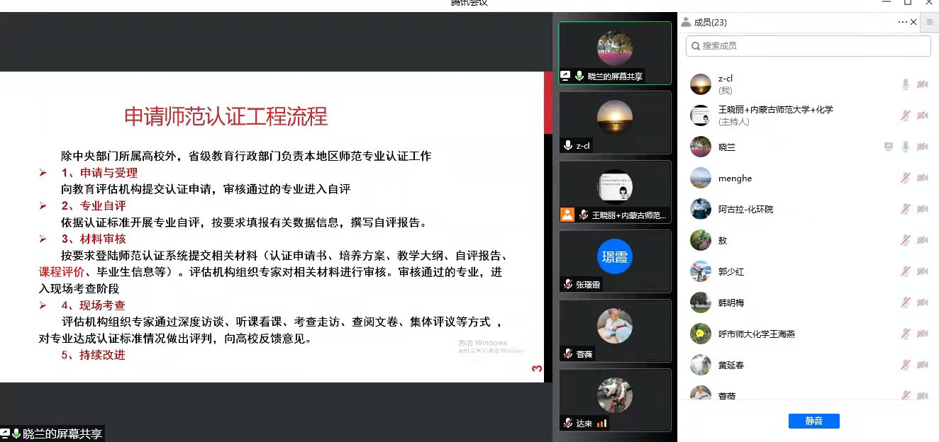 会上,郝向英经理指出师范类专业认证整改工作应当基于“员工中心、产出导向、持续改进”的师范认证理念,厘清培养目标、毕业要求及课程体系间的支撑逻辑关系。在面向产出导向的评价机制的建设和实践中,需要重点关注培养目标与培养效果的达成度、专业定位与社会需求的适应度、教师及教学资源的支撑度、质量保障体系运行的有效度、员工和用人单位的满意度。郝经理还详细介绍了师范类专业建设范式,分享了她们的专业建设的思路和举措,准备工作等。她强调,师范专业要以专业认证为契机,全面推进专业内涵建设,提升专业办学水平。参会人员围绕专业建设与师范认证整改工作展开了热烈的讨论和交流,并提出了建设性的意见和建议。