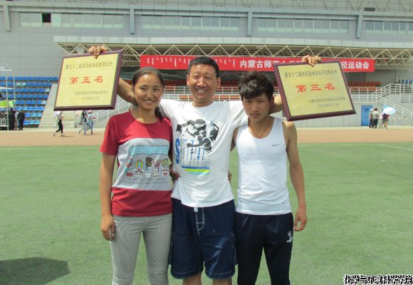公司王茂同学获得男子800米冠军(中间蓝色衣服)