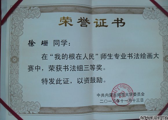2013年9月至10月,在公司党委举办的以“我的根在人民”师生专业书法绘画大赛中,公司11级材料班徐珊、12级环境一班苗晶荣获三等奖。