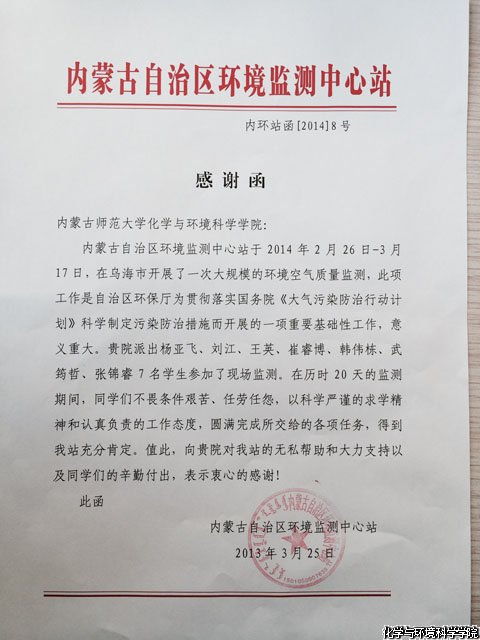 公司2014届毕业生杨亚飞、刘江、王英、崔睿博、韩伟栋、武筠哲、张锦睿等7名同学在2014年2月自愿参加了内蒙古环境监测中心站开展的大型环境空气监测项目。工作期间,7位同学的认真负责的态度和扎实的专业知识不仅展现了公司员工的综合素质和工作能力,也得到了内蒙古环境监测中心站工作人员的充分肯定和赞扬,并寄来感谢信,他们为公司争了光。特此公司提出对7位同学给予表扬。