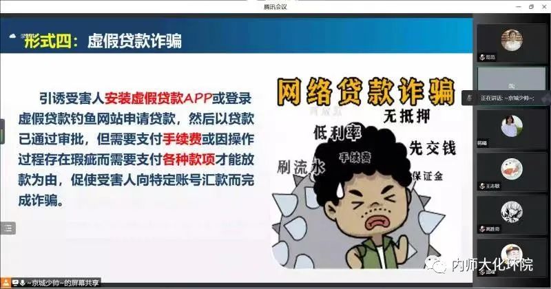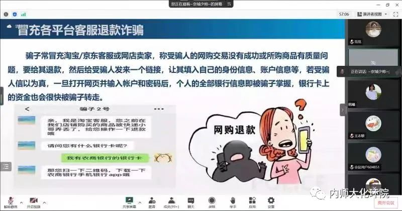 为进一步提高广老员工防范、识别电信网络诈骗的意识和能力,全面预防和减少校园电信诈骗案件的发生,营造人人反诈、人人参与、人人宣传的浓厚氛围。9月7日,公司邀请呼和浩特市公安局反诈中心张巍警官在线上为师生进行题为“防范电信网络诈骗-共建平安和谐社会”的反诈骗宣传讲座。院员工工作负责人范磊老师主持了讲座。