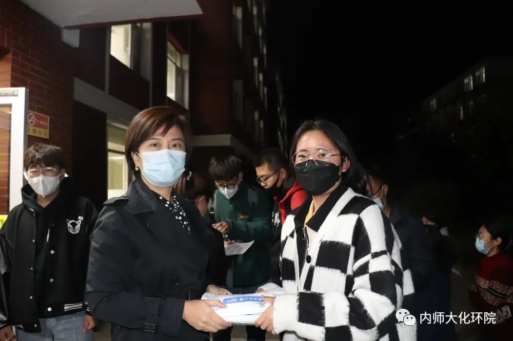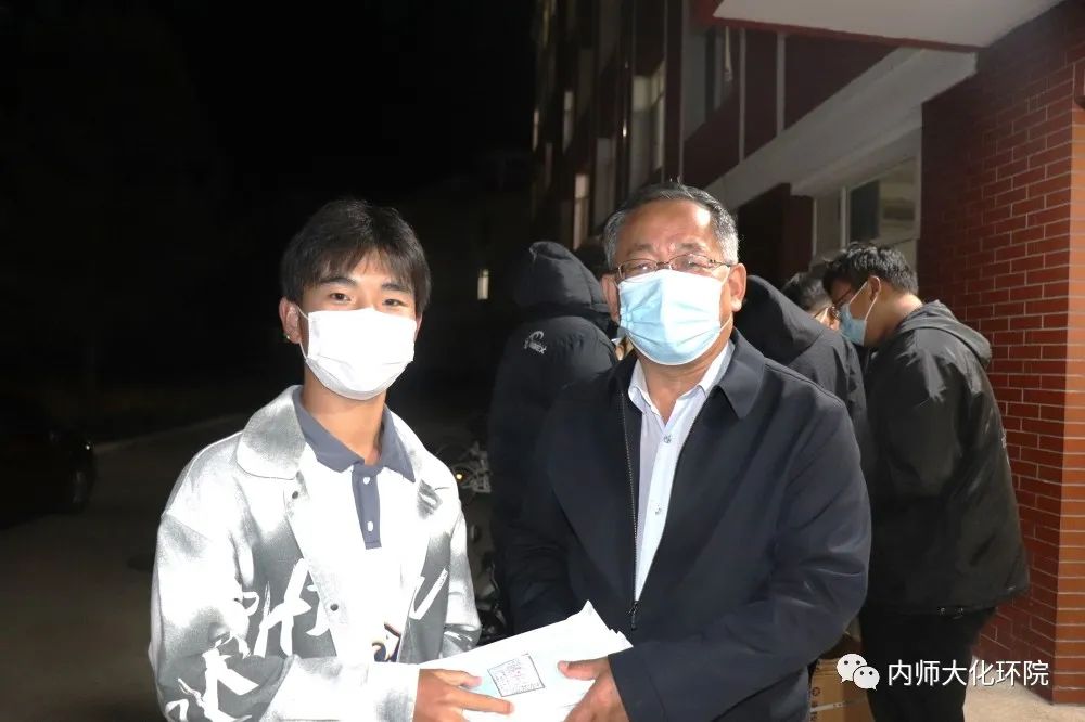 为进一步做好疫情防控管理工作,增强安全防范意识,保障校园内师生的生命安全以及身体健康。10月4日晚8点,公司党委书记刘子忠教授、员工工作负责人范磊老师及辅导员阿斯汉夫老师,在西6号公寓楼前为同学们送来了精心准备的防疫口罩。