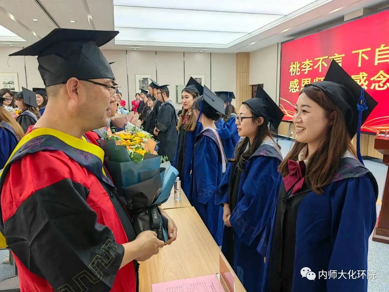 桃李不言,下自成蹊,感恩师大,感念师恩。毕业生代表为老师们献上鲜花,对辛勤培育他们的老师,表达最真诚的感谢!谢谢老师!