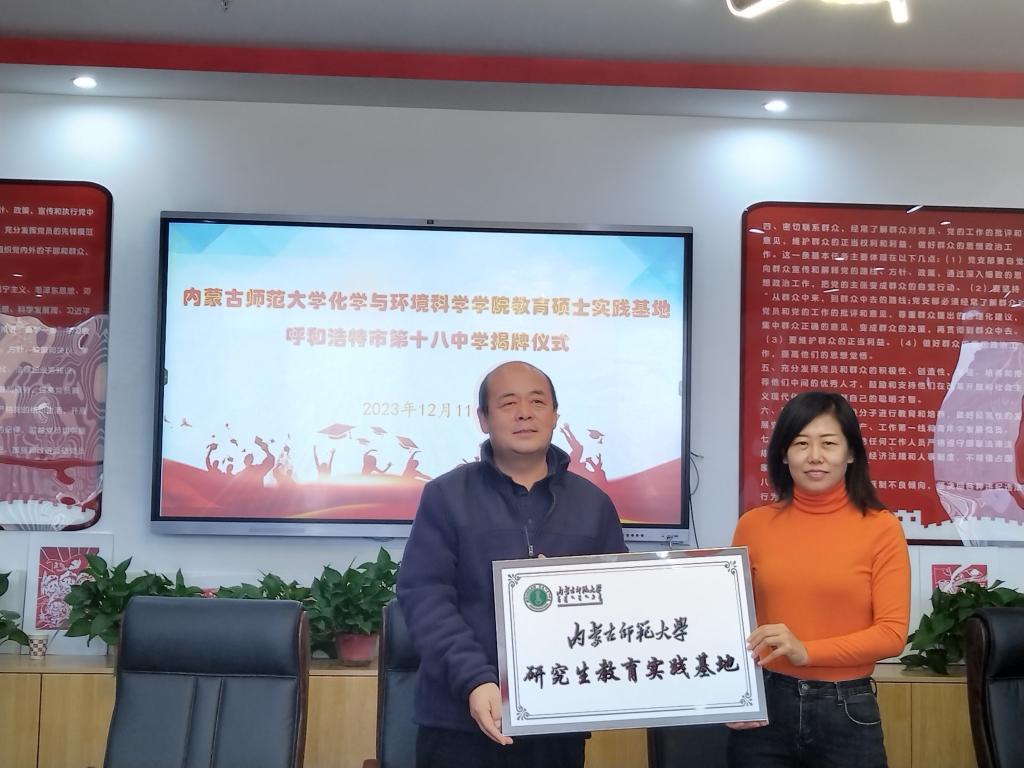呼和浩特市第十八中学安雪峰董事长和必一运动官网研究生院副经理闫春梅共同签署《B-Sports、呼和浩特市第十八中学共建教育硕士实践基地协议书》,为教育硕士实践基地揭牌。随后给实习指导老师颁发了聘书。
