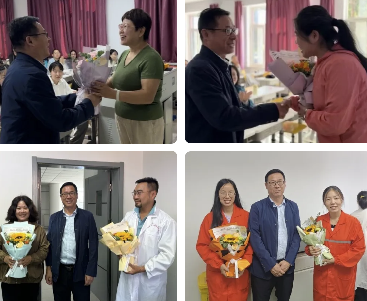 9月10日上午,林海河、范磊等公司领导上午第一节课、第三节课前来到行知楼、理工楼、实训中心等,他们手捧鲜花,满面笑容,为工作一线的教师们献上鲜花,送上节日的祝福。