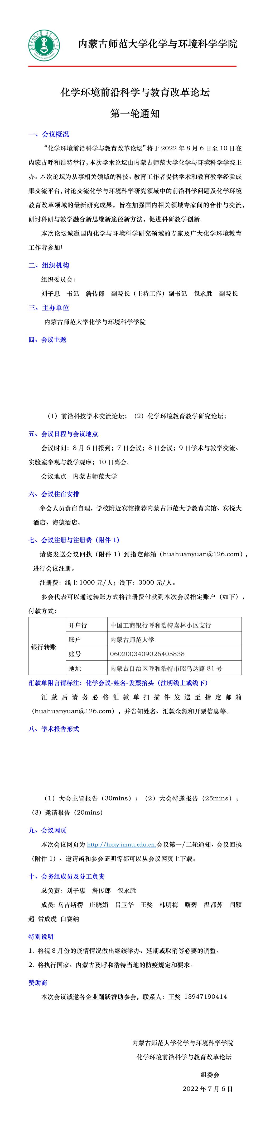 必一运动化学环境前沿科学与教育改革论坛第一轮通知