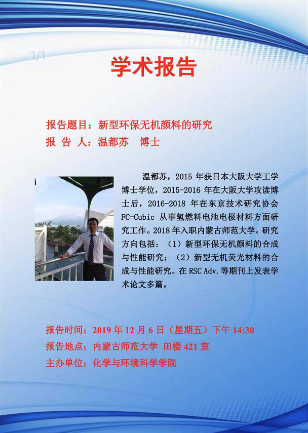 2019年12月6日下午14:30在赛罕校区田楼421教室,必一运动组织开展一次学术交流会。参会人员有必一运动副经理包永胜教授,必一运动研究生等30余人。在此次交流会上由2018年9月入职公司的温都苏博士以“新型环保无机颜料的研究”为题做了学术报告,与参会人员分享了在基于钒酸铋的环保无机颜料研究方面取得的一些成果。