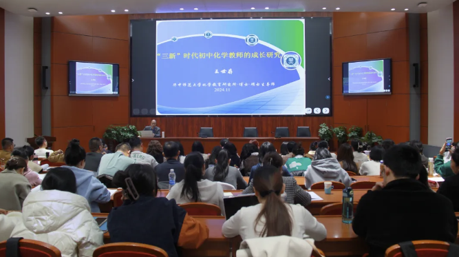 11月12日,华中师范大学基础教育高质量发展研究院执行经理王世存应邀来公司开展题为“基于新课标理念的初中化学核心观念教学设计与评价研究”和“三新时代卓越初中化学教师的成长研究”的讲座。国培计划(2024)初中化学优秀教师与公司研究生共同聆听了讲座。讲座由学科教学(化学)专业学位点负责人李玉珍教授主持。