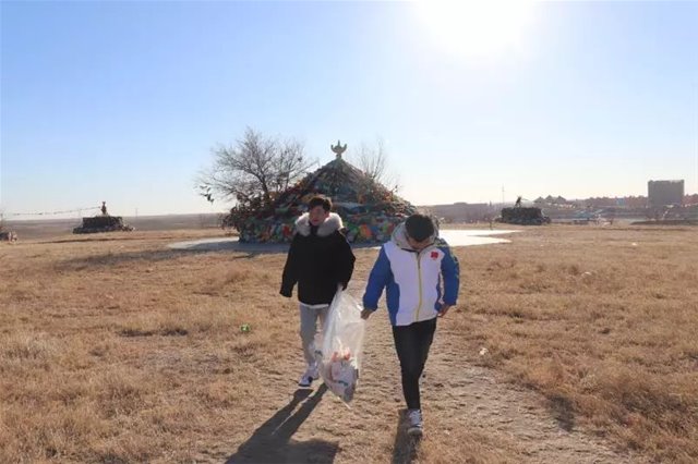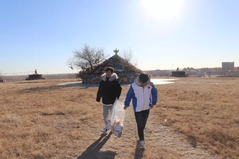接下来的几天,公司继续进行假期实践活动,在辅导员何朝鲁门老师的带领下,志愿者们前往科右中期敖包。首先志愿者们先按照习俗绕敖包三圈,然后开始清扫周围的垃圾。虽然天气寒冷,但志愿者们丝毫没有松懈,认真做着自己的工作。